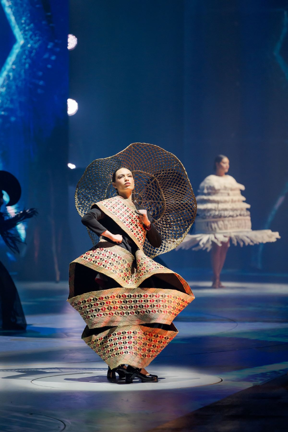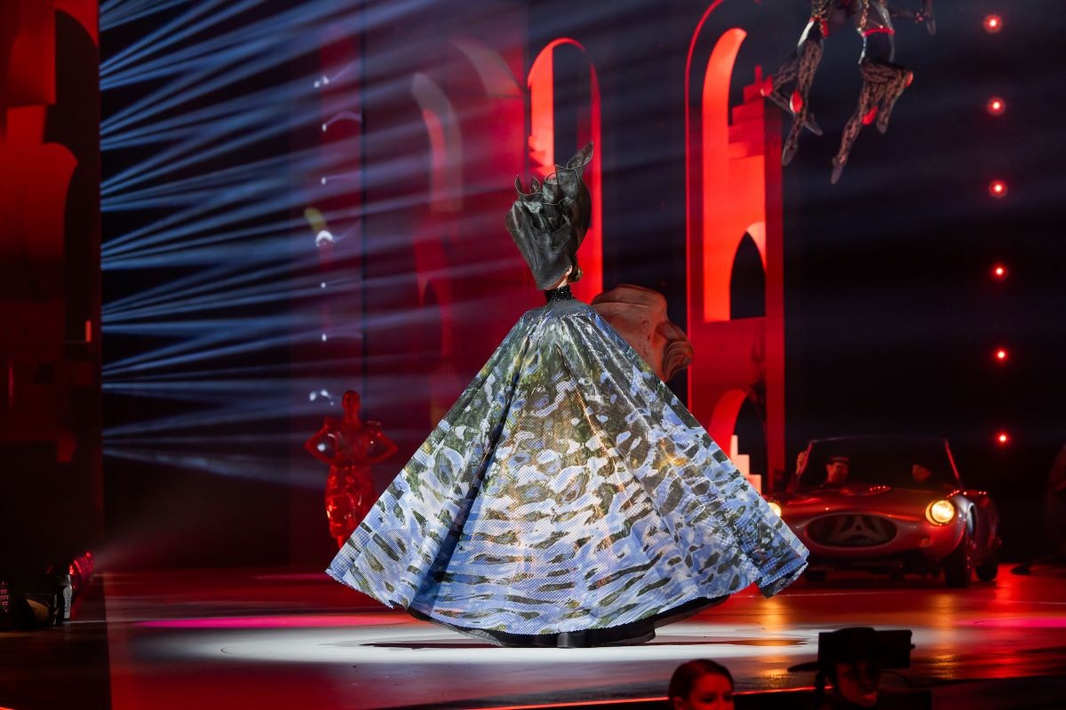 The heart of 2025 WOW Show: Rise is of course the wearable art designs, and these are as wildly creative, innovative, charismatic and entrancing as ever. Given the plethora of visual effects competing for audience attention it could be helpful for a section of the digital screens to be allocated to introducing the six design categories and sharing the competing finalist work’s titles, designers, and country of origin or key idea. In 2025, 120 finalist designers showcasing 85 imaginative and vivid works compete for six category and a dozen special awards, and runners up are also awarded for each title (purchasing a WOW programme is worthwhile to keep track of the enormous selection of garments, and to follow along with the awards and their recipients). Taking out both the 2025 Supreme WOW Award and the Myths & Legends section award is United States designers Dawn Mostow and Ben Gould’s delicate and refined dual entry Tsukumogami, which imagines “…the secret life of objects…Century-old porcelain vases, imbued with spirit, begin breathing...” This reviewer’s personal favourite, the sophisticated, sculptural, and subtly poignant Worn Landscape by New Zealand designer Cushla O’Connell wins the Aotearoa section award and the Wētā Workshop Outstanding Design Special Award.