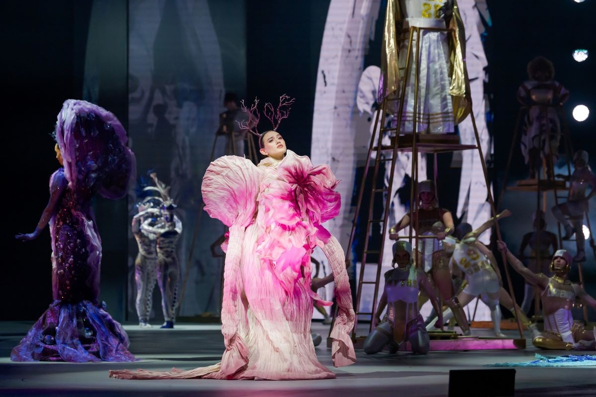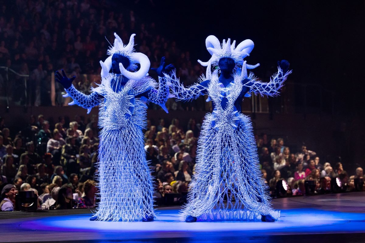 The World of WearableArt’s awards show is a valued contract employer of dancers in New Zealand, and each year the dancers consistently provide the basis of the performance design as they are onstage for much of the show. In 2025 it is great to see the artists of the New Zealand Dance Company alongside the freelance dancers. Although some of the dance work is muted by competing colour palettes or being layered behind other performers, impactful choreography for the dancers is achieved during the openings of the Neon and Air sections, which expand beyond the stage perimeter with simple yet bold visual effect. Movement material is commercial in style, with significant use of isolations and static floorwork. Bold costumes by Gabrielle Stevenson and effective use of the stage revolve make the hip hop influenced Neon section choreography memorable. Under the direction of Aerial Coach and Choreographer Jenny Ritchie, the trampoline artists add a sweetly surrealist and anti-gravity touch, and the four circus artists are positively sublime in their breathtaking and exquisitely technically refined aerial work. Exposed transitions in and out of aerial equipment that proved challenging in previous years are completely resolved in 2025 WOW Show: RISE, with the aerialists sustaining focus and creating rich dramatic tension with every appearance.