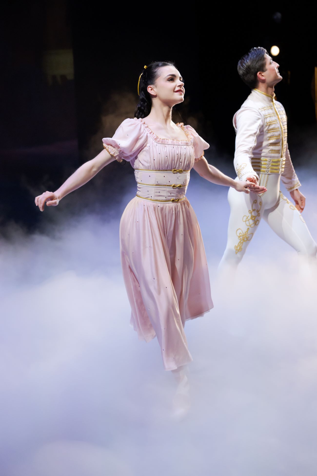That redoubtable, adventurous Aunt Drosselmeyer, danced brilliantly by Kirby Selchow, costumed in over-the-top vivid purples, dramatic necklace and hat, arrives again to 'copter Clara and the handsome Nutcracker prince away to the land of snow. Piloting the buzzy bee, they soar over the stunning splendour of our volcanic regions with their steaming vents, to our glacial ski fields in the Southern Alps. The snowing stage, a crystalline wonderland, becomes a world of swirling, graceful figures in full-length tutus. This aligned with our accustomed memory. The black bodice insert on a stark white, gossamer fabric, echoes the black and white mountains of our alpine landscape. The audience warms to this classical spectacle. Rose Xu and Cadence Barrack catch my eye.