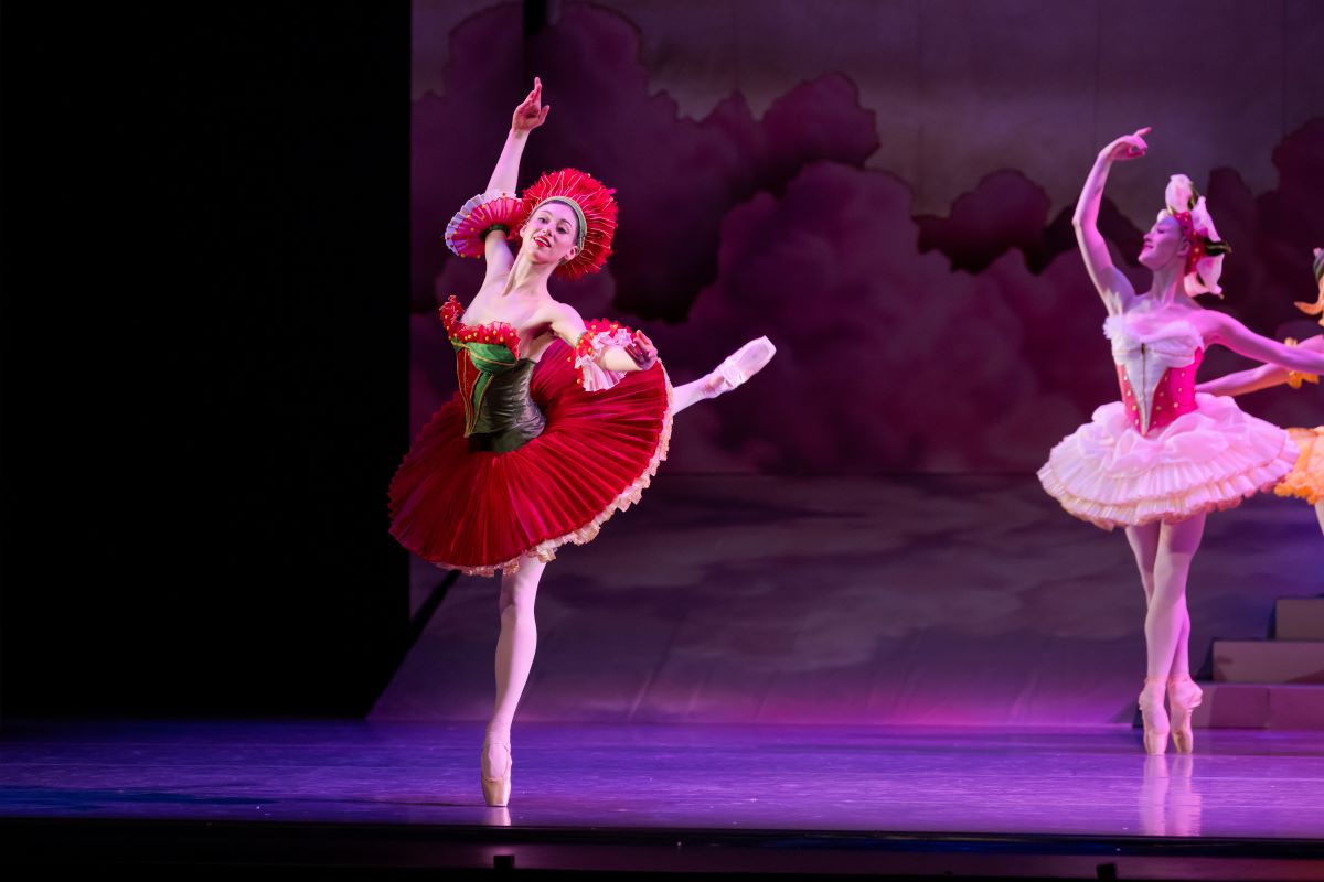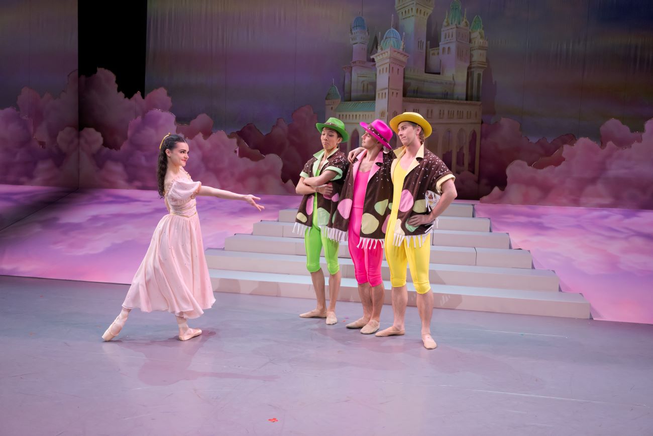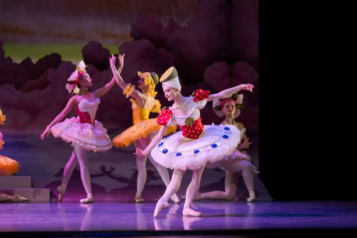 Off they fly, through the clouds, to arrive at the fairytale castle in the Kingdom of Sweets. Built with walls of pink candy floss, we are treated to a Russian dance by the pavlovas; a delectable pas de trois wearing kiwifruit turbans, whipped cream tutus, with strawberry accents on bodices and sleeves. The male pas de trois, in citrus, lime and strawberry wear short shirts; one is decorated with chunks of 'rocky road' confection. Was that hokey pokey ice cream with a swirl of cream and a stick of flake atop? Jennifer Ulloa and Shaun James Kelly were the unique taste of chocolate fish, swift and sweet, light and seductive dancers. The only question I heard from many who loved the production otherwise, was, "What was the brown and pink?" The costume does not give enough of a clue, they felt. (But the programme is informative.)